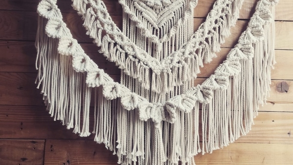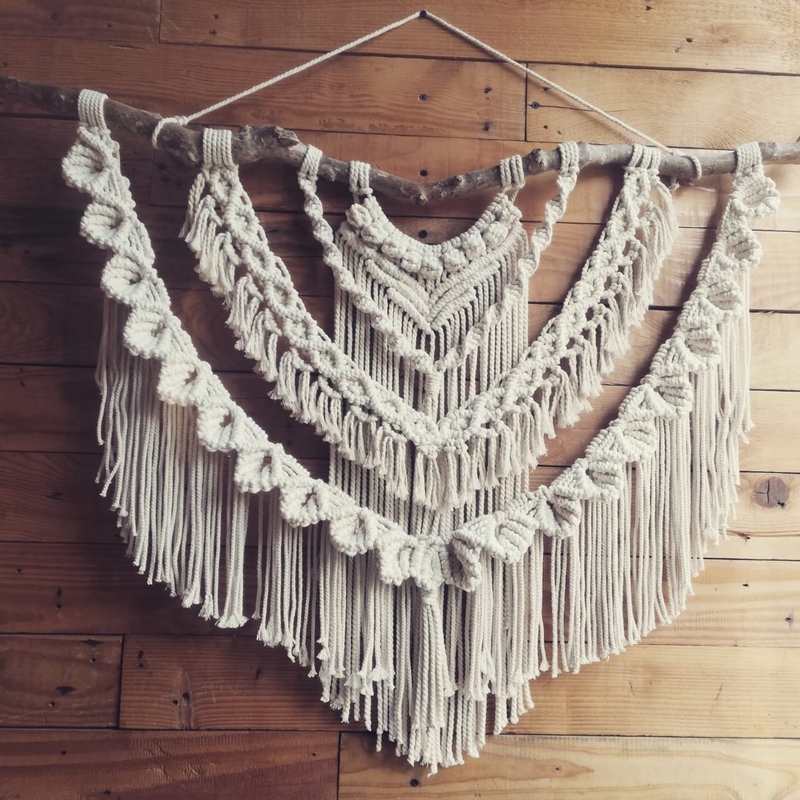 معلّقة حائط مكرمية مصنوعة يدوياً مربوطة بغصن شجر طبيعي